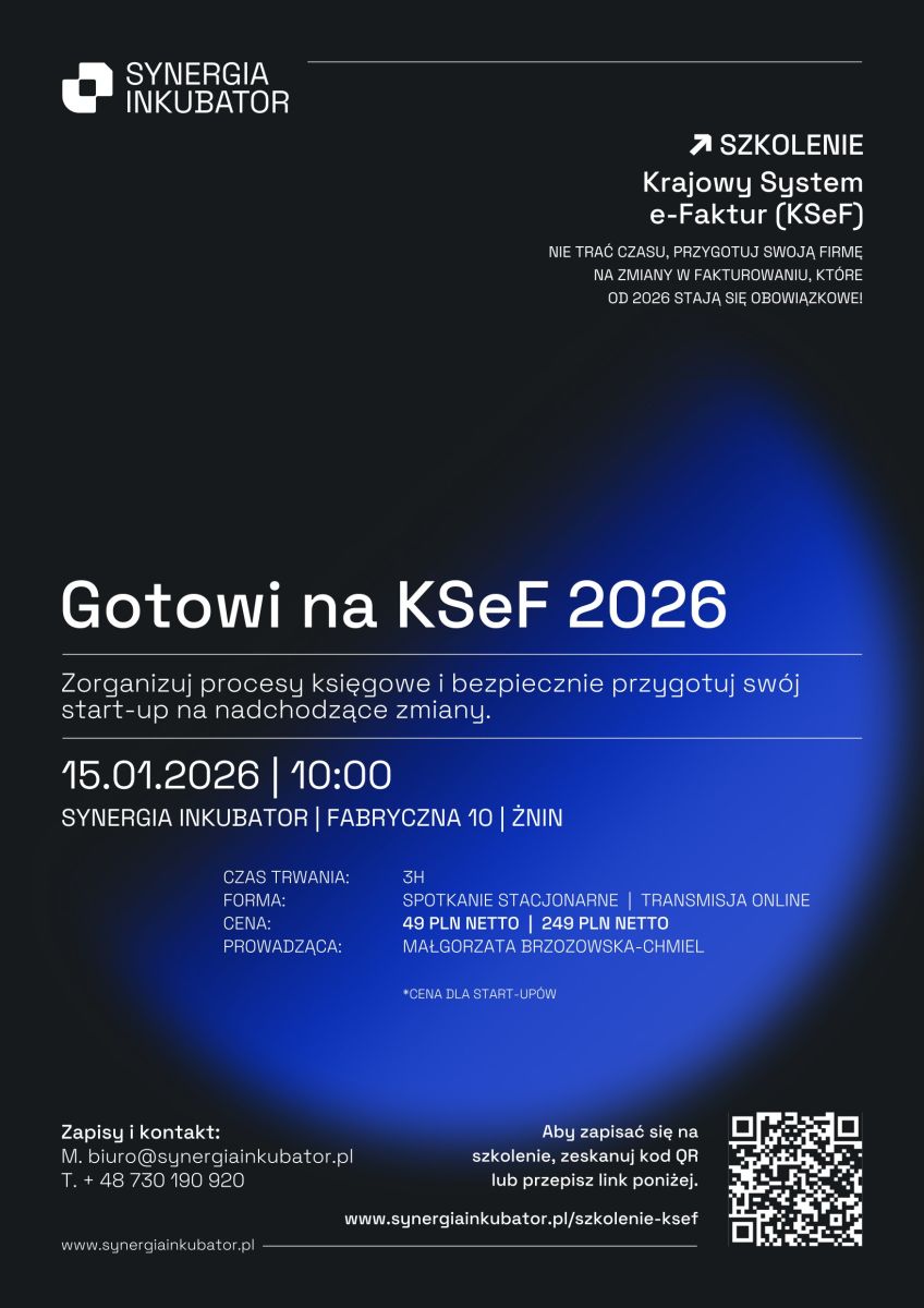 Zapraszamy przedsiębiorców oraz start-upy z regionu na szkolenie „KSeF 2026 w praktyce: wdrożenie, procedury i bezpieczeństwo obiegu faktur”, które odbędzie się 15 stycznia w Inkubatorze Synergia w Żninie.